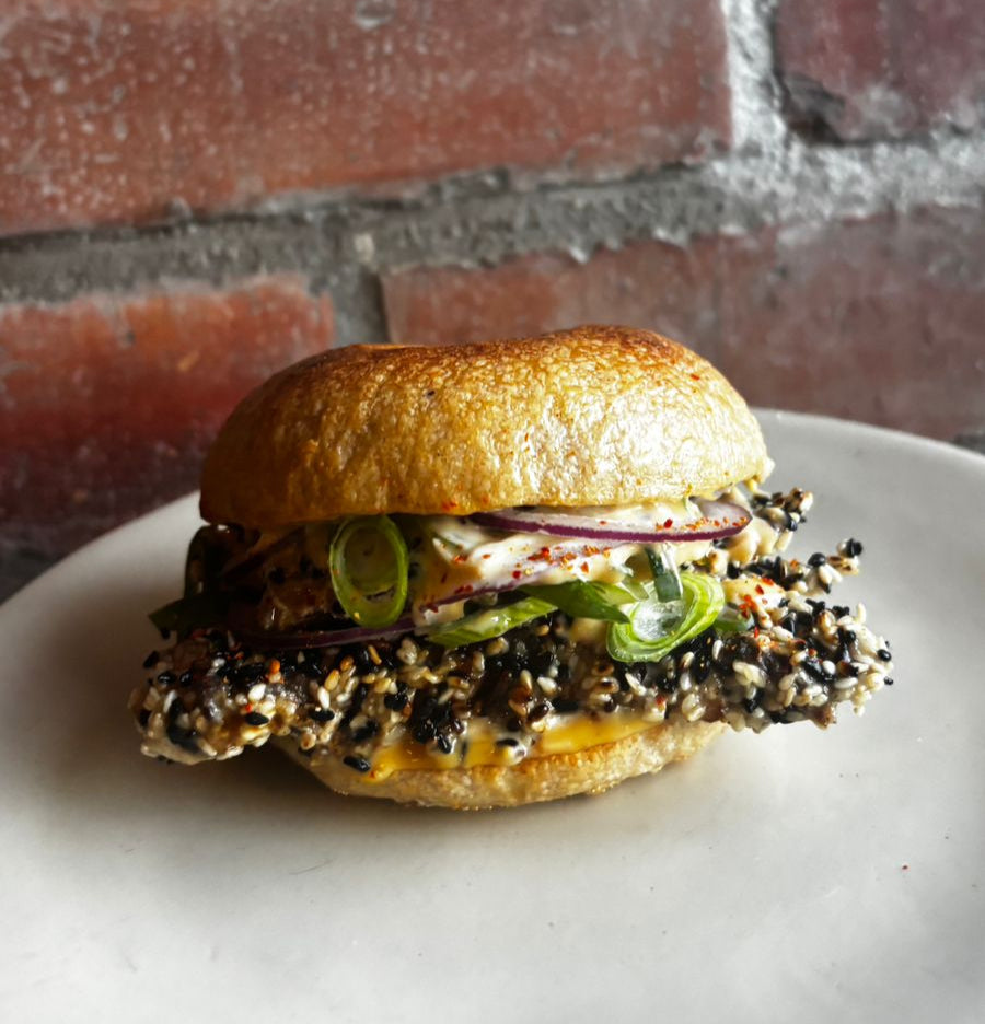 Chunky, sesame crusted fresh tuna, togorashi, red onion, kewpie-miso mayo, spring onion. Likely the best fish beigel you've ever had.